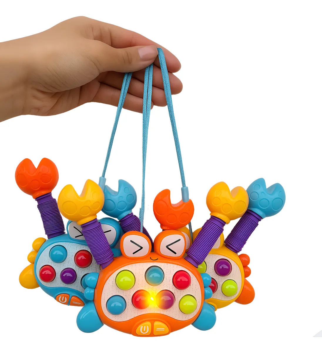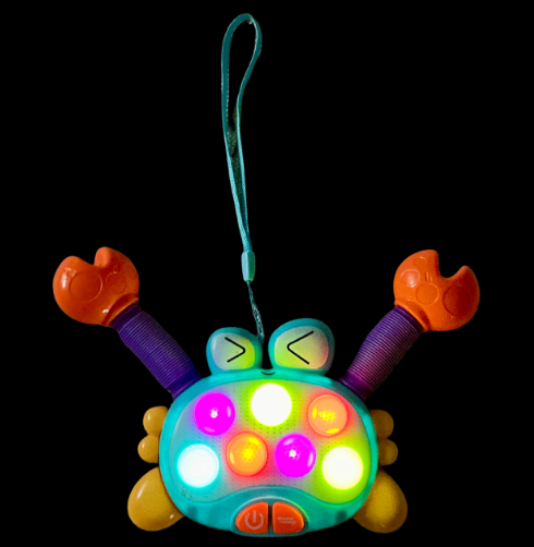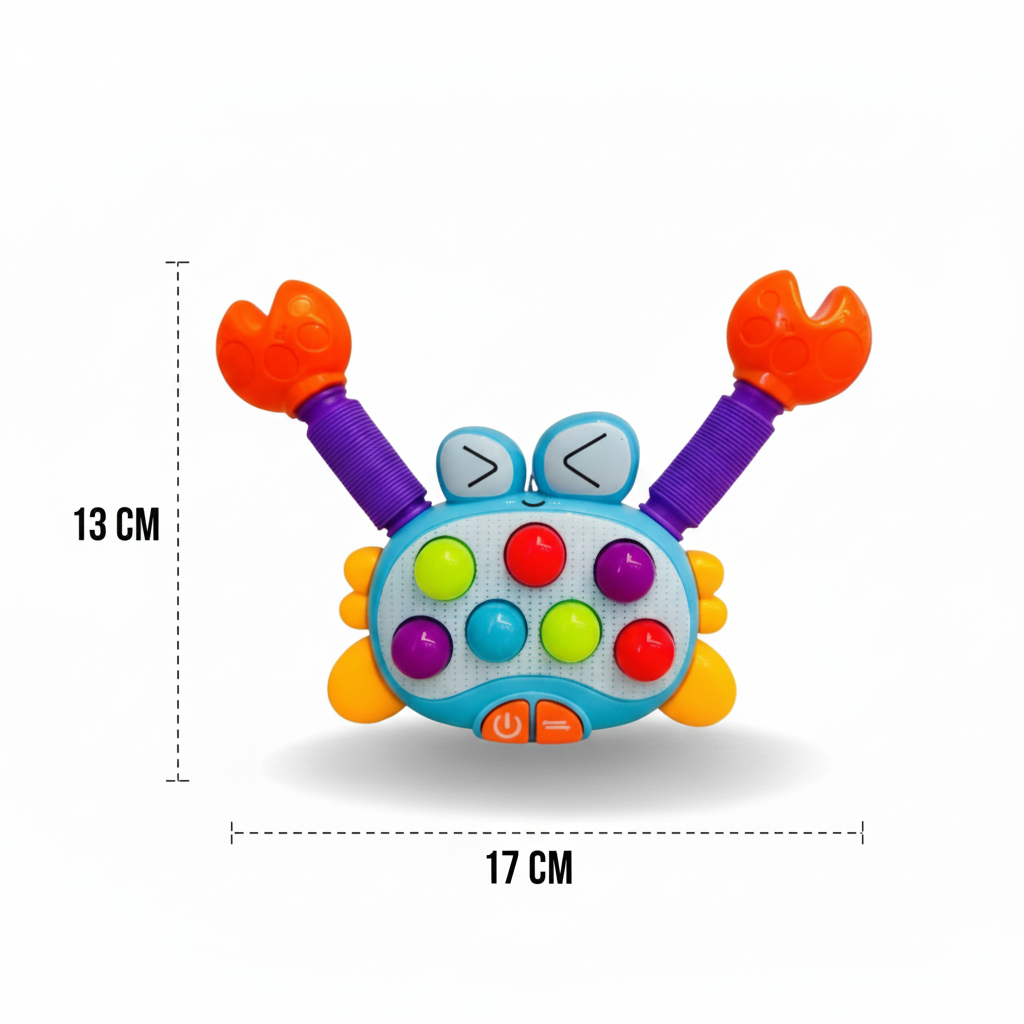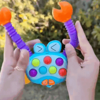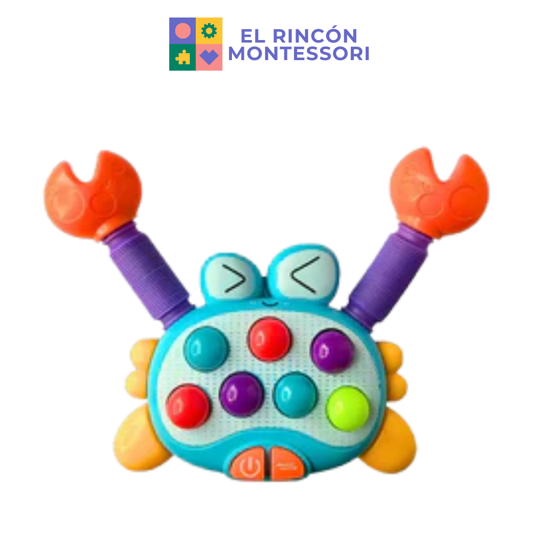 ¿Quieres un juguete que lo estimule sin aburrirse? Este cangrejo combina música, luces y pop its para horas de diversión. 🌈