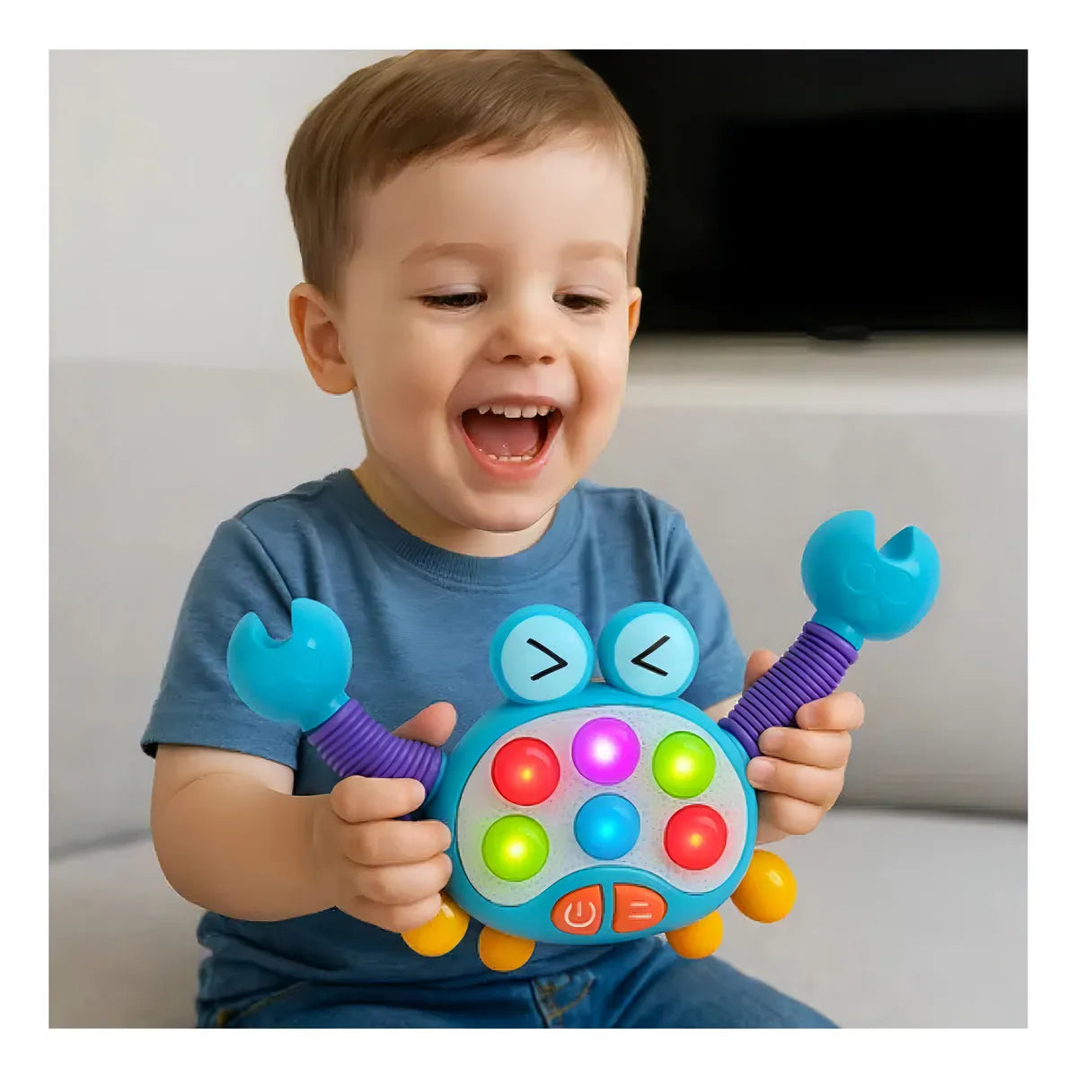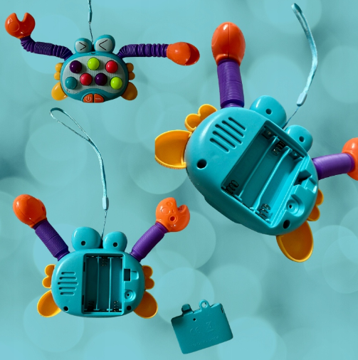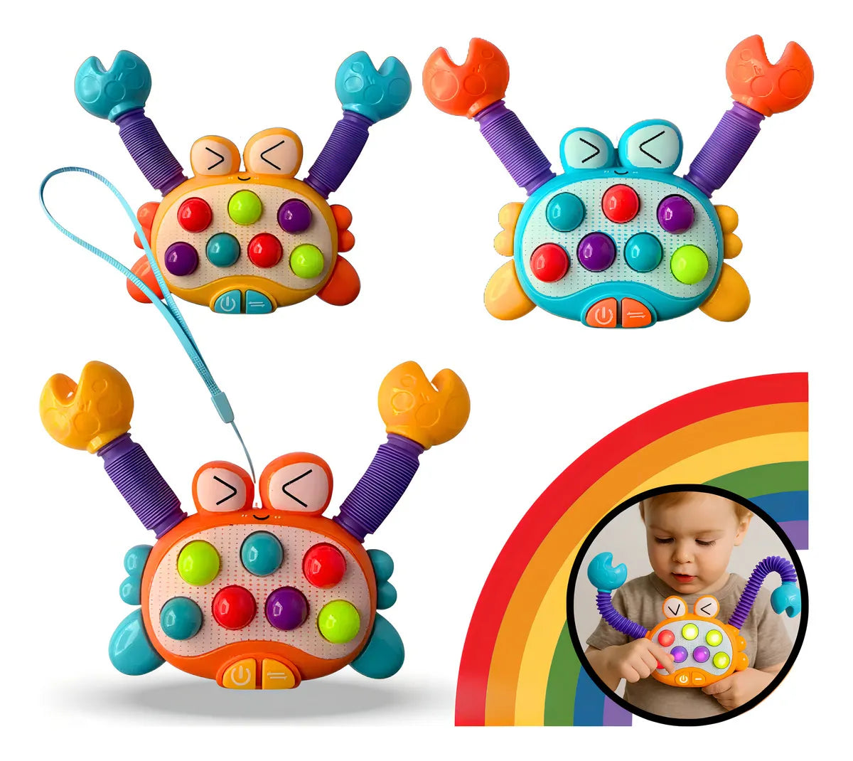¿Quieres un juguete que lo estimule sin aburrirse? Este cangrejo combina música, luces y pop its para horas de diversión. 🌈