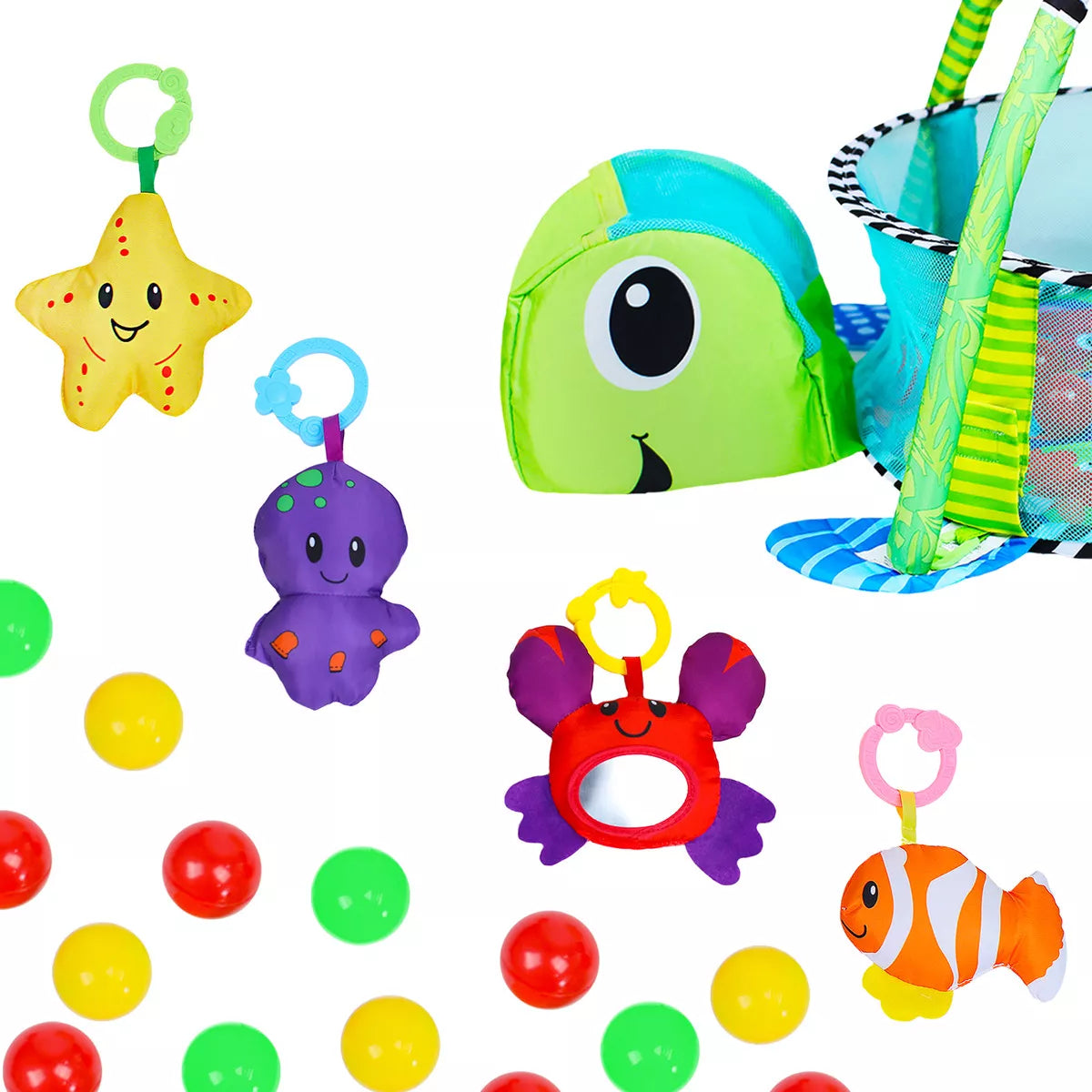 Incluye: Tapete 3 en 1, arcos, 4 juguetes de peluche, 30 pelotas
