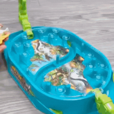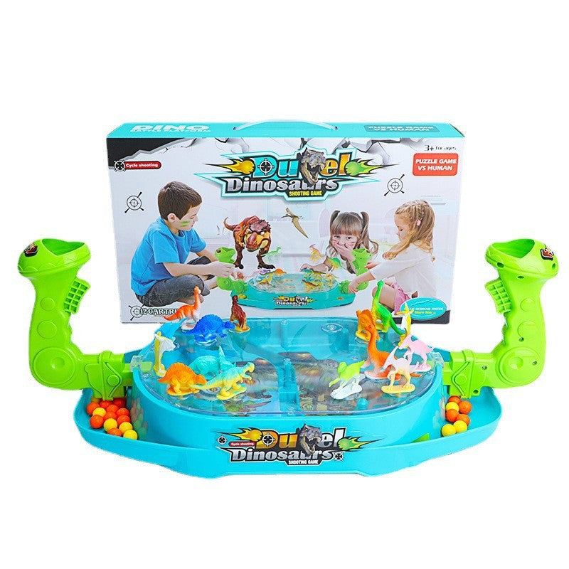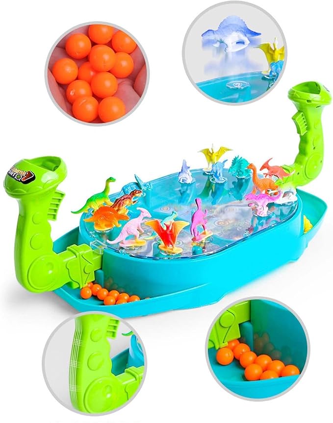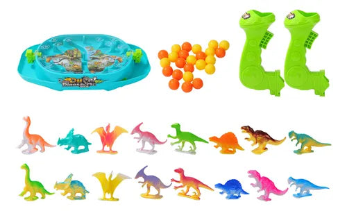 Incluye: 1 tablero de juego, 2 lanzadores, 24 balas, 16 dinosaurios