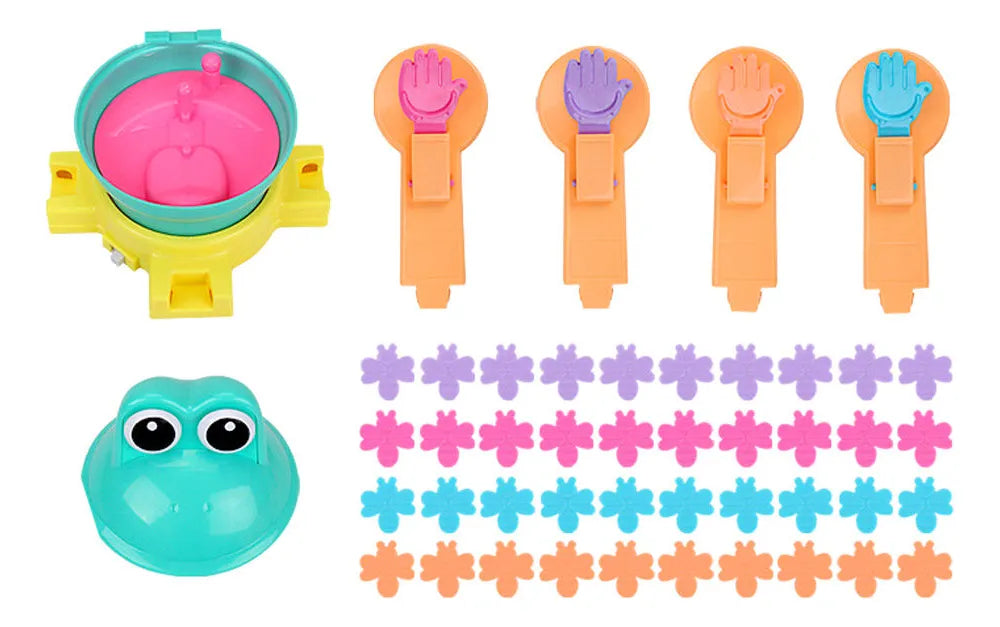 Incluye: 4 catapultas, 40 moscas (10 x 4 colores), 1 cara de rana