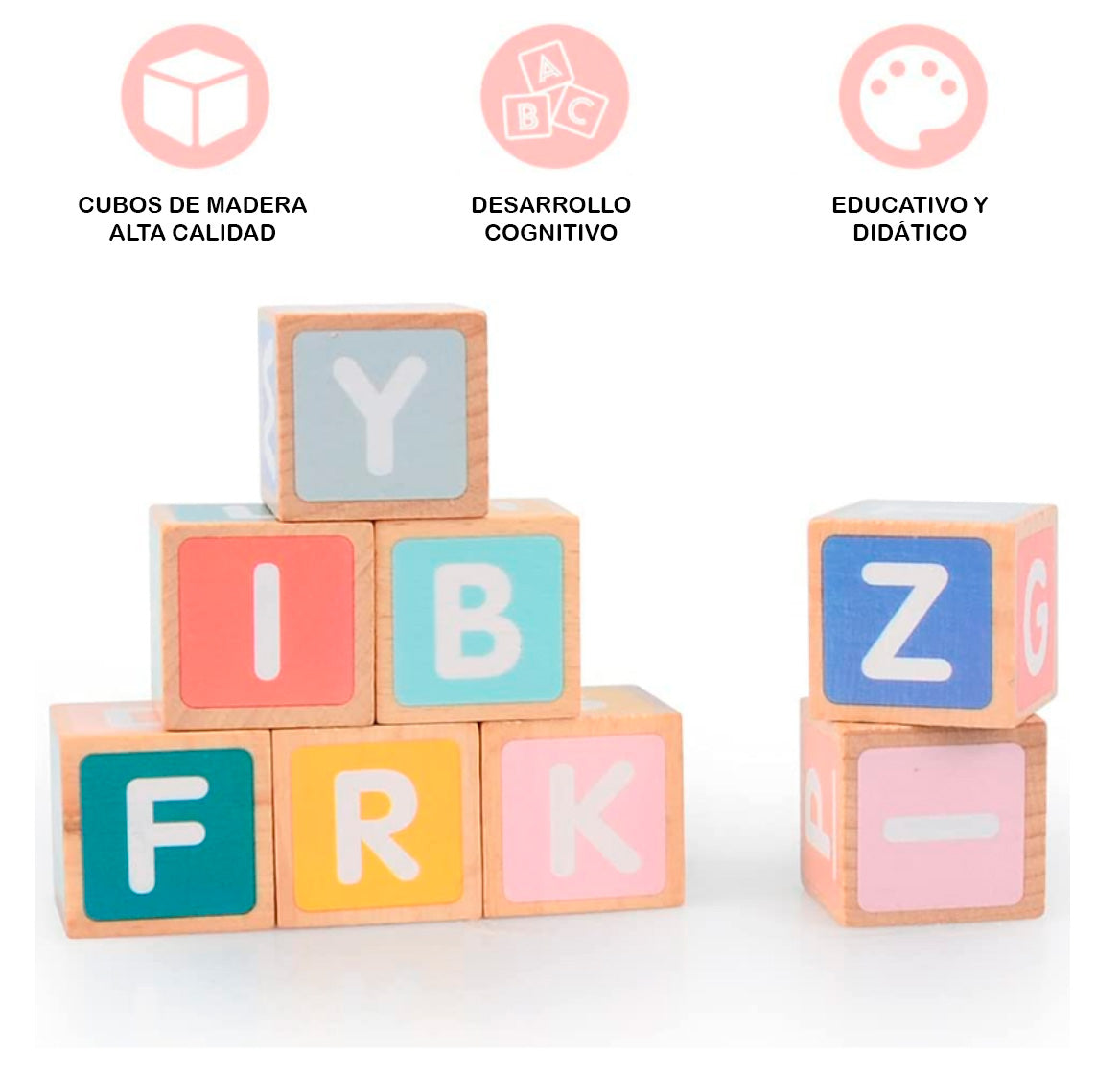Incluye: 27 tarjetas con palabras y 8 cubos de madera.