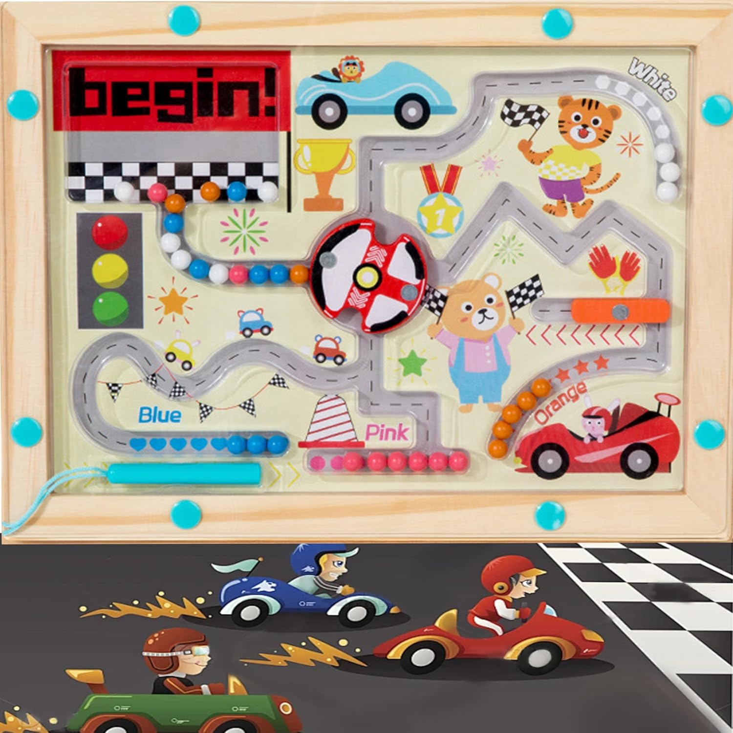 Incluye: 1 tablero laberinto con cuentas de colores