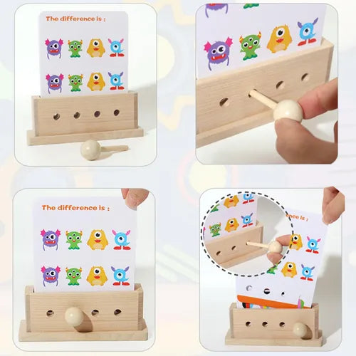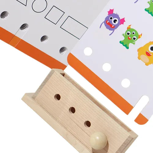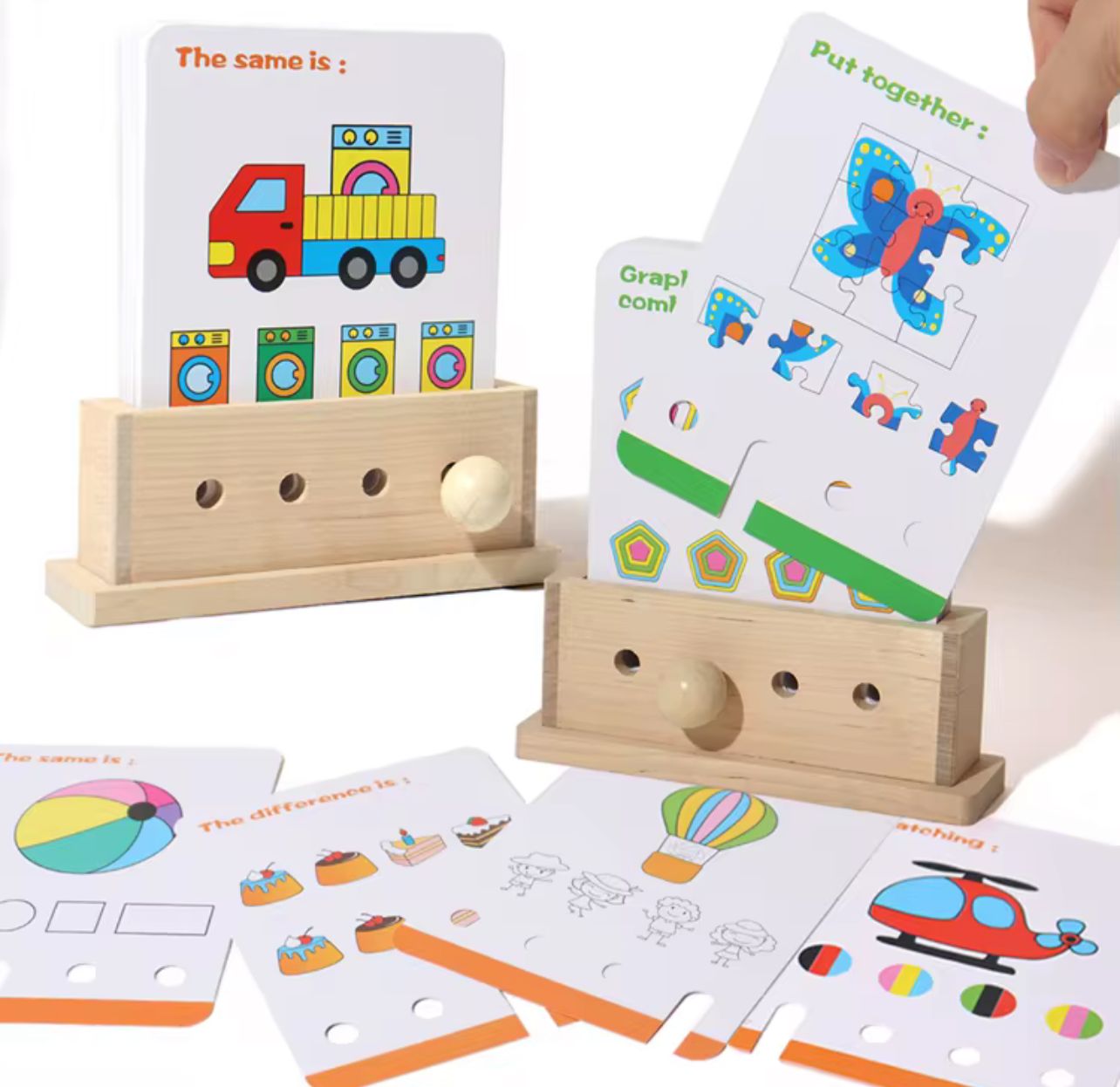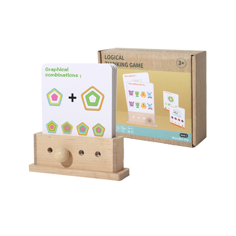 Incluye: Base de madera, puntero, tarjetas de desafíos lógicos (doble cara).