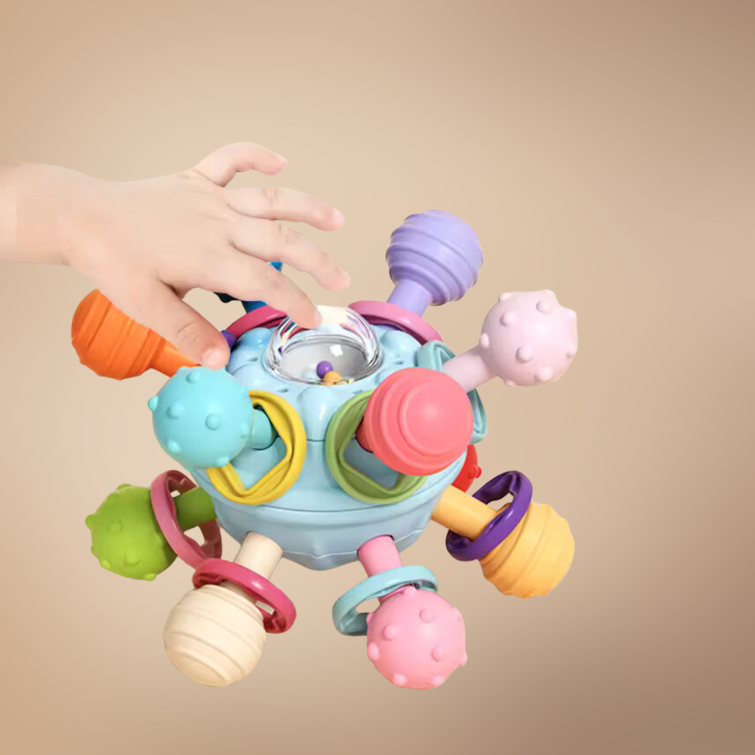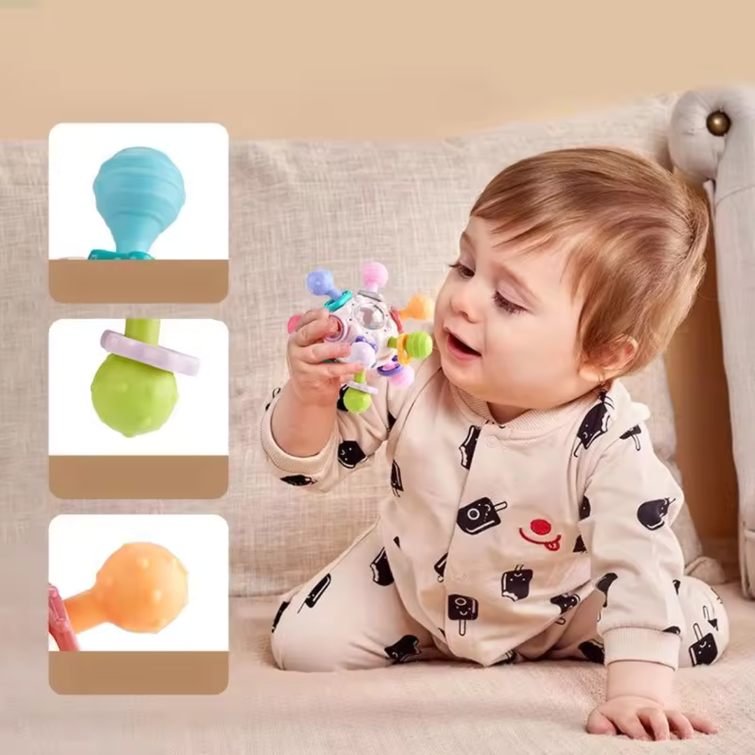 Nuestro Sonajero Sensorial no solo entretiene, también masajea suavemente sus encías. 🦷