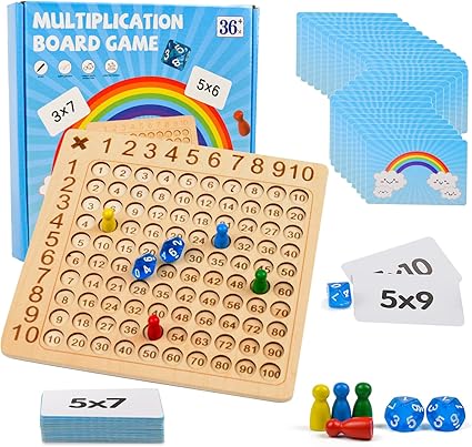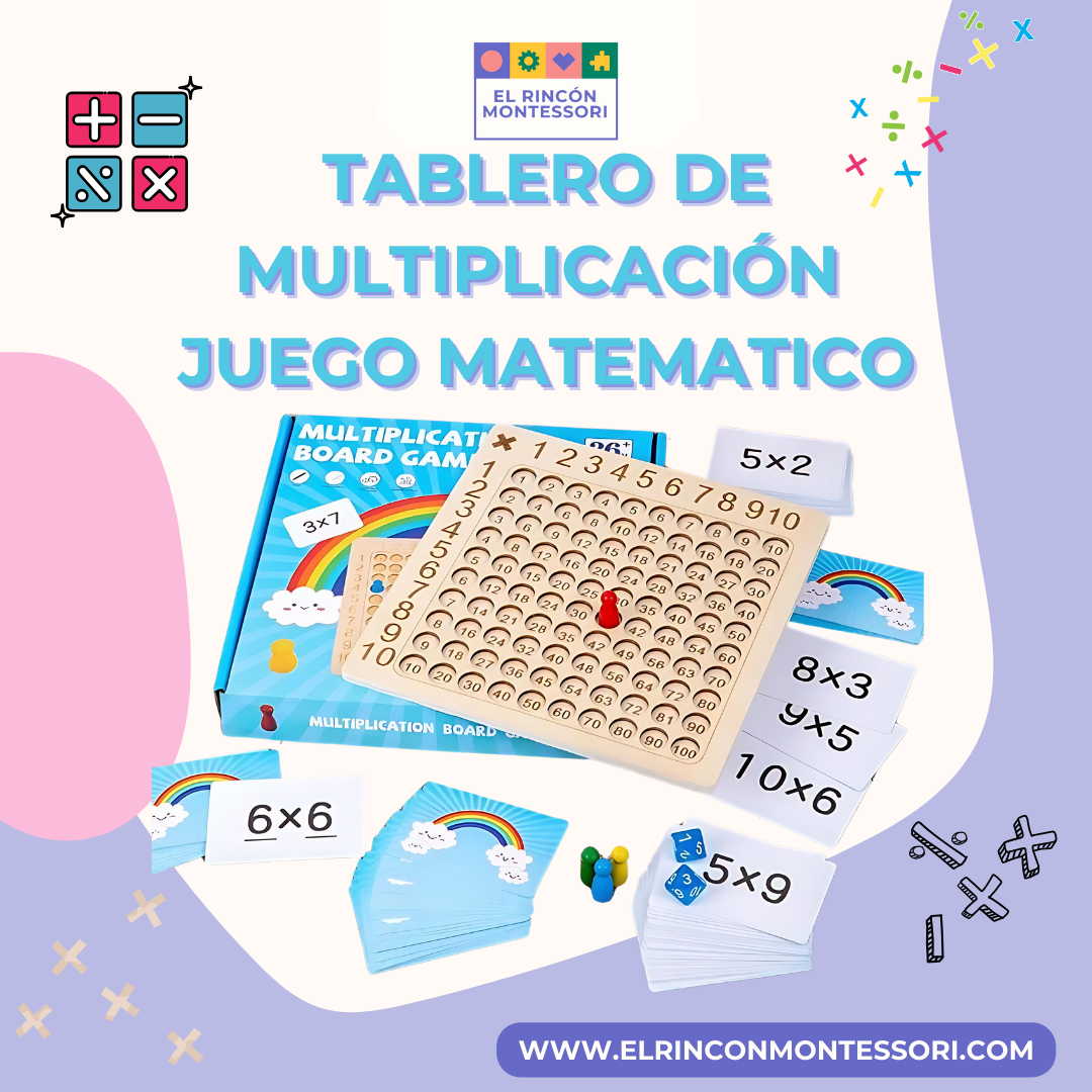 Incluye: Tablero de multiplicación Montessori y 100 cartas de multiplicación.