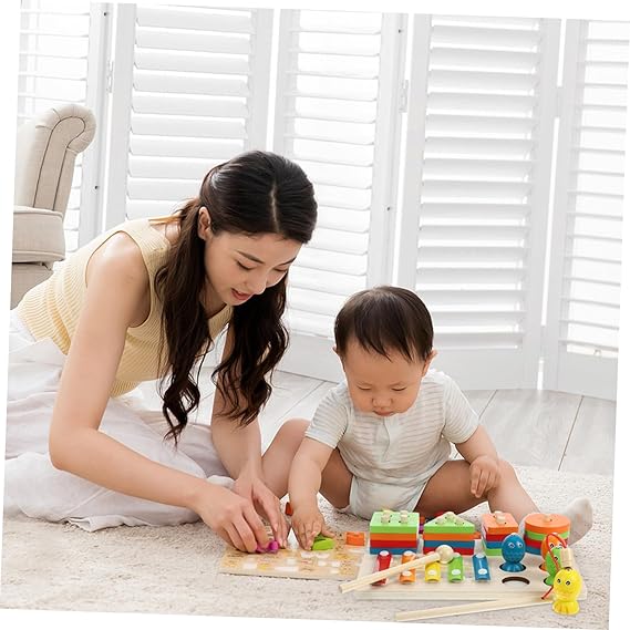 Incluye: 1 base de madera, 5 peces de juguete, 1 caña de pescar de madera y figuras geométricas.